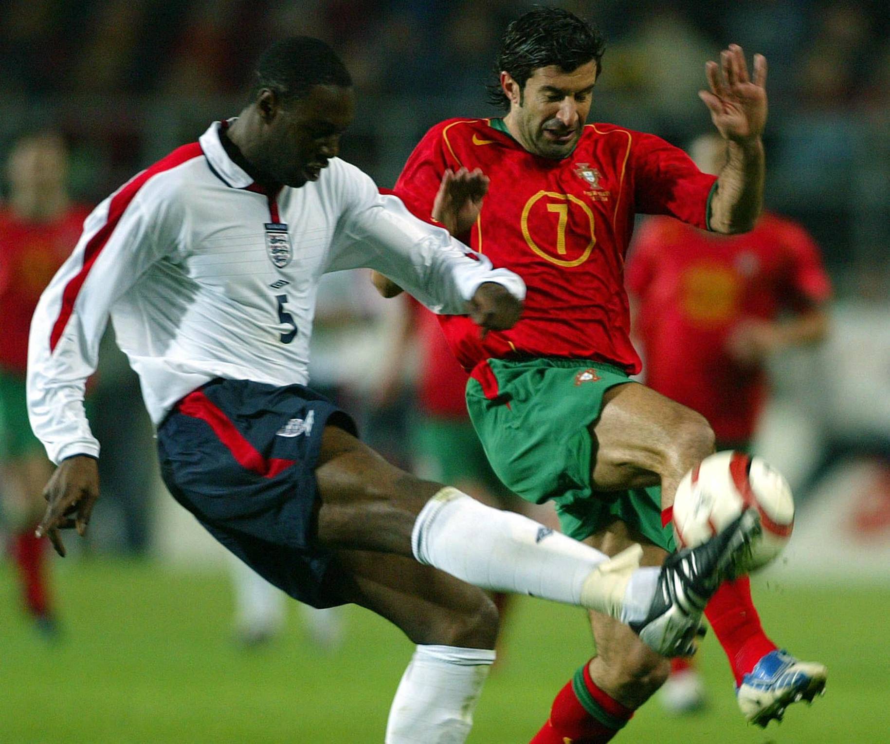 At his peak, Ledley King could rival the best in the world. Here is putting the shackles on Portuguese legend Luis Figo in 2004.