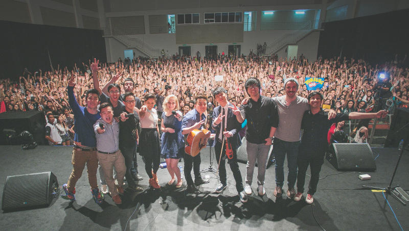 International YouTube stars (from left) Jason Chen, Jun Sung Ahn, David Choi, Kina Grannis (partially hidden) and Madilyn Bailey posing for a photo with some fans ahead of iM4U’s Reach Out 2014 volunteerism convention.