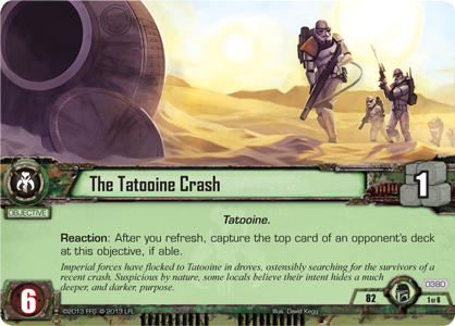The Tatooine Crash objective itself looks like a solid capturing machine: the ability to mess with your opponent’s deck every turn is huge. Sure, capturing seems random enough, but I’ll take anything that is potentially disruptive in the long run. After all, it’s card gaming 101: disruption is the arguably the next best thing, after card draw.