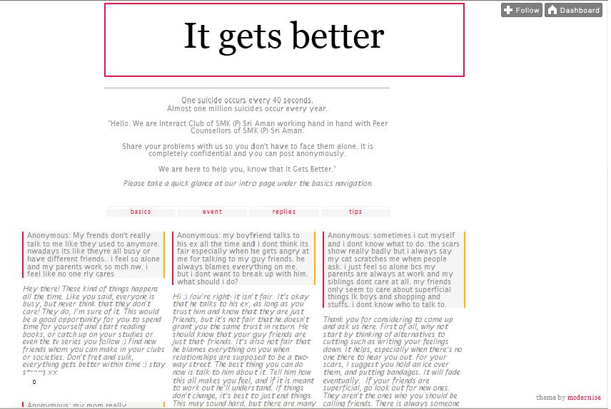 The Interact Club of SMK (P) Sri Aman, Petaling Jaya, Selangor, has set up a anonymous counselling service using the micro-blogging site Tumblr, for students dealing with depression – the first step of a campaign that ultimately hopes to raise greater awareness about depression and suicide among young people.