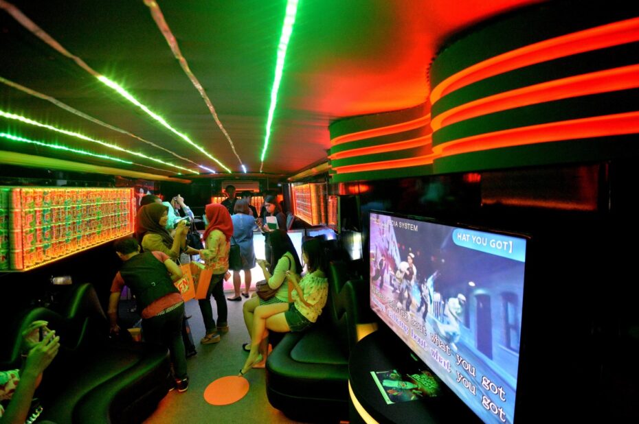 I probably wouldn’t have guessed it myself, except here I was aboard F&N’s Fun Blast Party Bus, having a whale of a time. The bus was glitzy and glamorous, kitted out in the way I always imagined The Rolling Stones would have fashioned their tour bus – psychedelic bar at one end, a big screen television taking centre stage, a karaoke machine and selfie booth to keep up with 21st century demands and seats so plush, you could easily take a nap on them.